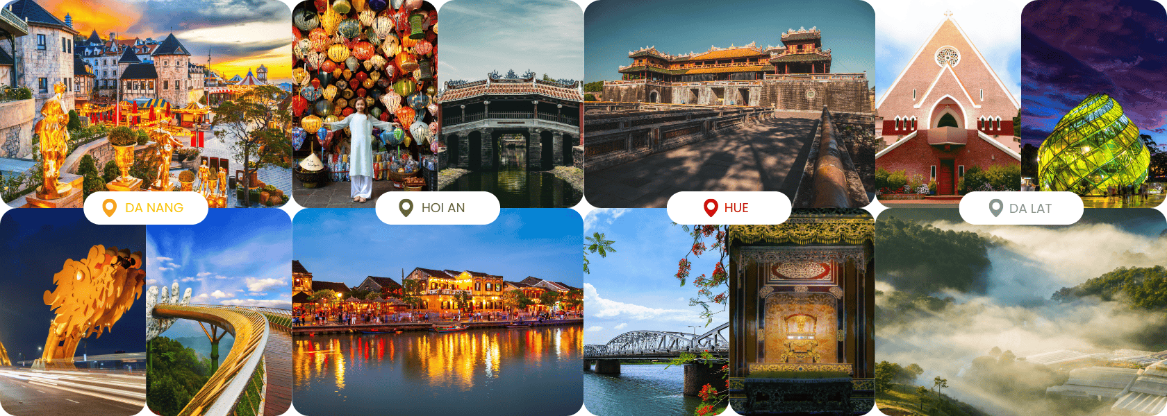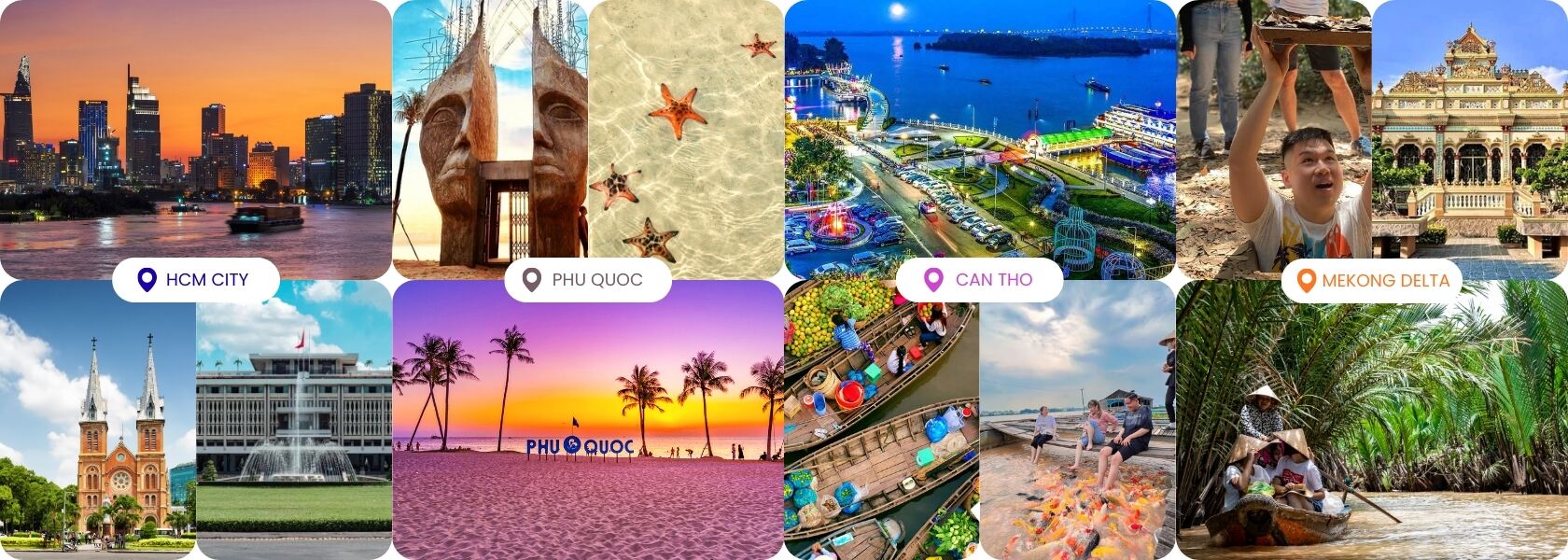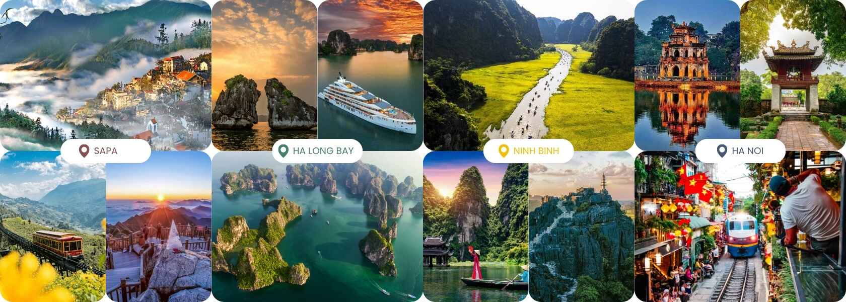 Ho chi Minh - Skydeck observation - Cu Chi tunnels - Mekong Delta - Hue- Danang - Bana hill - Golden Bridge- Hanoi city - train street - Halong bay - Sung sot cave - Titop island - Luon Cave