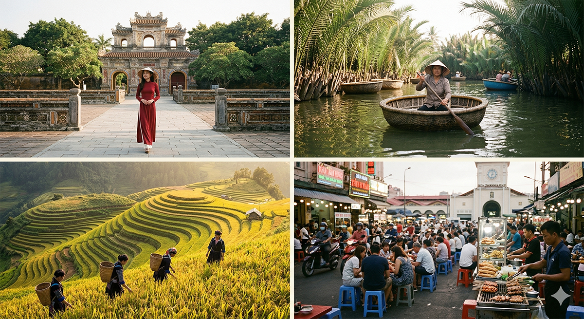 Vietnam private tour destinations: Hue Imperial City, Hoi An basket boat, Sapa rice terraces, Ho Chi Minh City — Indochina Travel Group