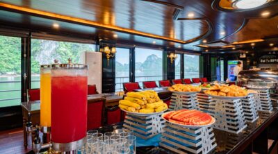 • 07:00: Dragon Bay Cruises continues to pass by amazing karst towers while tea, coffee, and light breakfast are served with fresh air and peaceful surroundings.